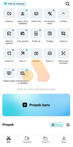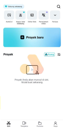 Saat kita membuka CapCut Mobile, kita pertama kali akan melihat Layar Utama, atau Layar Rumah. Layar ini berisi fitur penting seperti Mendaftar untuk masuk ke akun CapCut, Membuat Proyek untuk memulai proyek baru, dan Perpustakaan Sejarah untuk melihat daftar proyek yang telah kita buat sebelumnya.